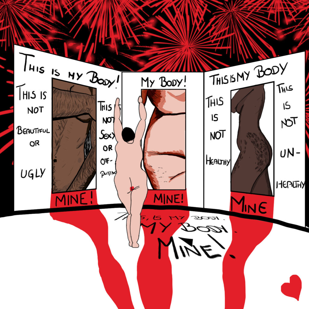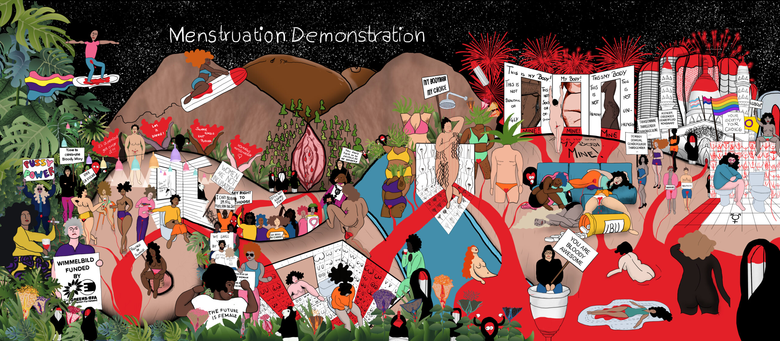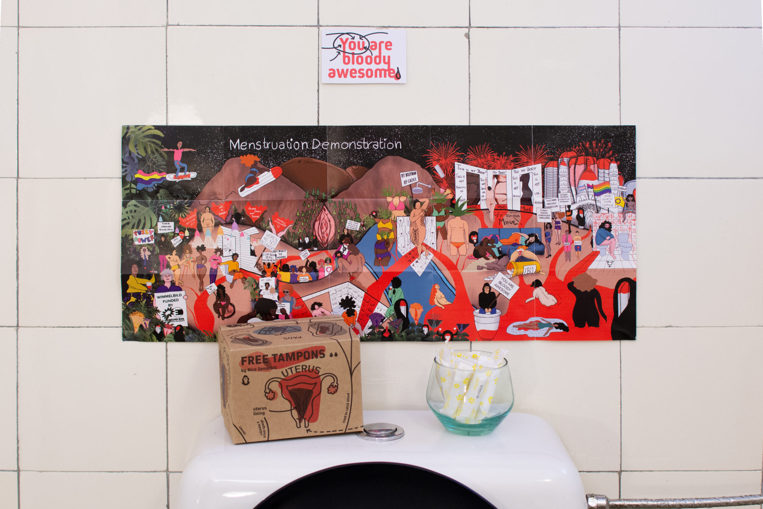 Wimmelbild als Beilage für kostenlose Tampons – mit dem gesamten Team von Nico Semsrott – Periodenprodukte sollten kostenlos sein! – Period Products should be for free, period!